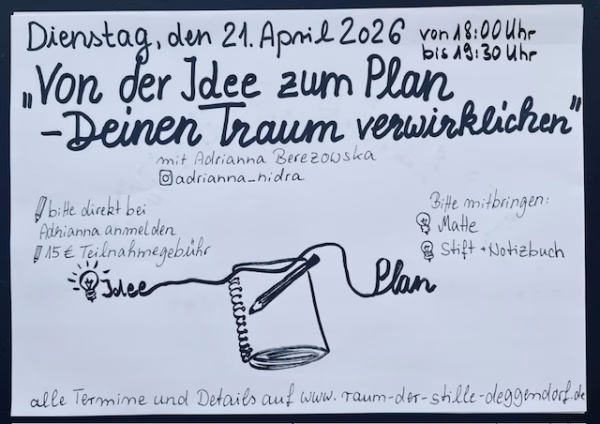 Dienstag, den 21.04.2026 von 18:00 Uhr bis 19:30 Uhr Workshop mit Adrianna Berezowska „Von der Idee zum Plan – Deinen Traum verwirklichen“ im Raum der Stille